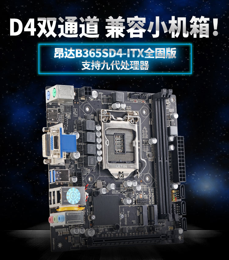 本款主板为昂达B365,型号为:昂达B365SD4-ITX,标准itx主板,17×17cm,所以机箱可选择性很强,主板支持6789代全系列CPU,DDR4内存,单根支持到16G,支持M2的无线模块+m2的固态硬盘,五项固态电容供电,三个sata3.0硬盘,HDMI+VGA+DVI全接口,内置USB3.0,可以扩展一个com串口,应用相当广泛,家用高清客厅,绘图游戏吃鸡等,工业用途各个行业都可以。