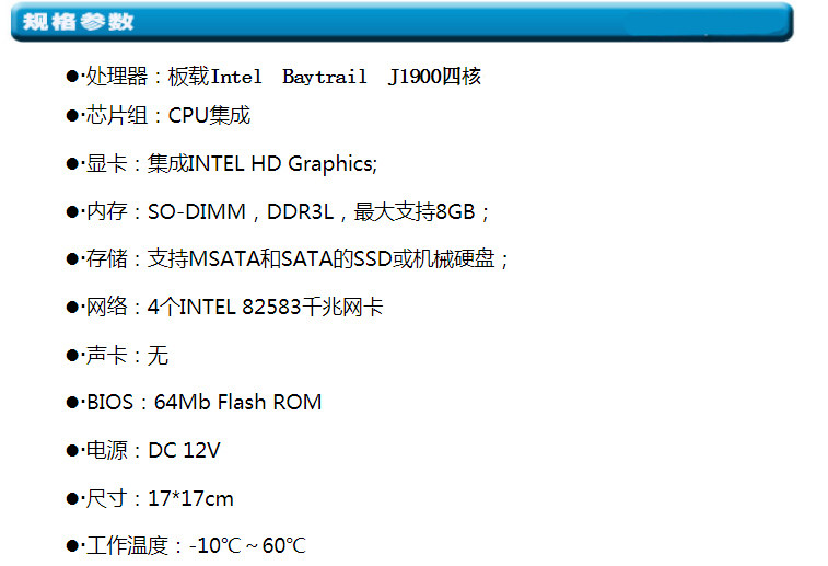 ZA-J1900L4是一款单芯片处理器的无风扇低功耗网安主板,该板采用J1900四核SOC单芯片处理器,集成四个INTEL千兆网络接口、1个MINI PCI-E、1个MSATA、1个RS-232、6个USB、1个标准2.5寸笔记本硬盘固定位等接口;该主板无风扇零噪音、体积小、结构紧凑、性能高、稳定性强,是嵌入式网络安全准系统中的上佳选择。